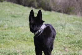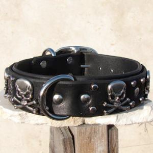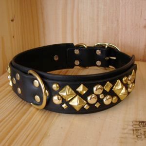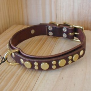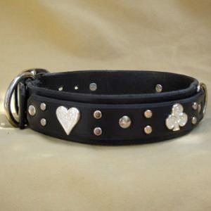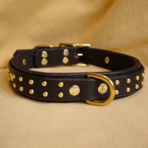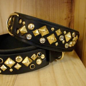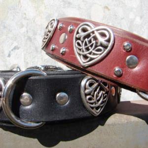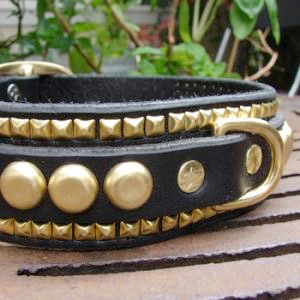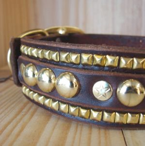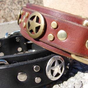 These collars are available in tan, black and brown (oxblood) most are made in 1 1/2 inch wide leathers but can be special ordered in 2 inch widths. They range in price from $90 to $200. They are handmade from genuine leather here in California. Each collar is made when the order is placed so orders may take a few weeks to be shipped.